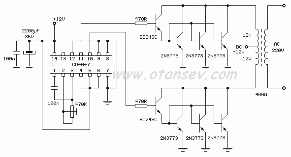 Şekilde, 4047 entegresinin osilatör olarak kullanıldığı bir DC/AC konverter şeması görülmektedir. Bu devrede güç sürücü ve çıkış güç transistörleri normal BJT transistördür. Çıkış güç transistörleri ve trafo güçlü olduğu için bu devre ile 400W' a kadar AC yükler çalıştırılabilir